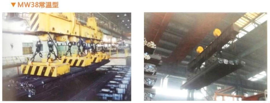 MW38系列電磁鐵運用獨特的磁路結構,具有散熱性好、透磁深,能穿透多層氣隙的特點,可吊運沒作捆扎或只作了簡單捆扎的棒材、扁鐵、角鋼等。可改善小圓鋼、螺紋鋼等這類型材吊時撓度較大的問題。有常溫型和高溫型.由于多采用兩臺或多臺聯吊,故其與掛梁連接多采用兩吊或四吊點結構,本樣本中所列均為兩吊點結構,訂貨時親注明與掛梁聯接的具體要求。